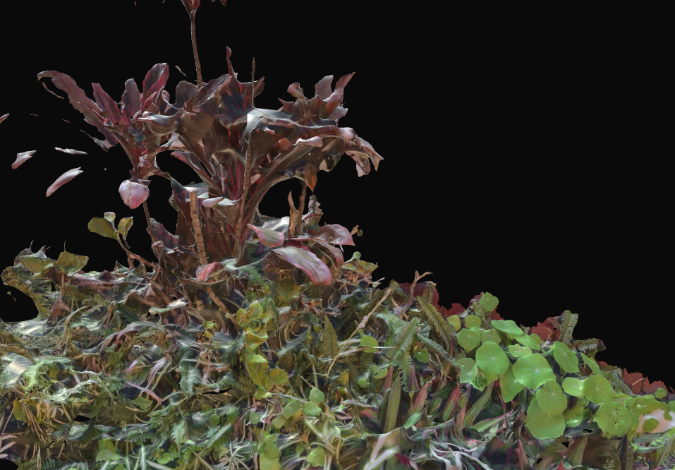 Cordyline fragments --> This is a lidar / 3D scan of some plants from my childhood home, including Cordyline Fruticosa Firestorm & ferns. The digital nature of the scan creates fragments / traces of memories, warped over time
