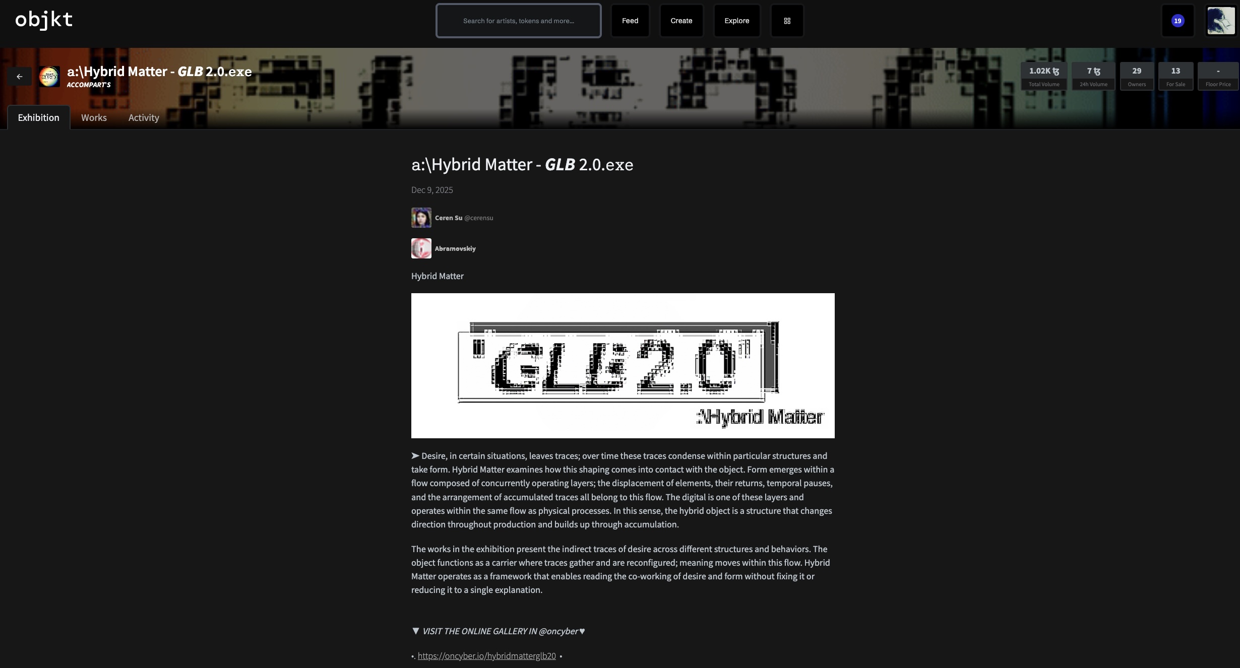collection available at https://objkt.com/collections/exhibitions/projects/hybrid-matter-glb-2-0... (individual NFTs available here for purchase/collection & viewing + AR option)