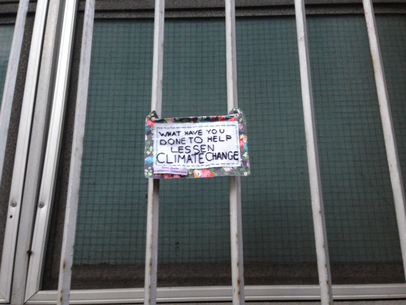 I embroidered the message "what have you done to help lessen climate change" because I think this is one of the most important issues currently facing the world (Earth) and I want people to think about their own behaviours and to find things that they can do at home and in their own lives to help lessen the issue. tomorrow I'll pin it up outside somewhere - will go looking for a good spot. the kit includes cable ties, and the fabric has holes punched in it already so it should be quick to install. another great thing was the whole project only took me a couple of hours this evening (whilst already pretty tired) so it's one of the quicker craft / fibre projects I've worked on! it's quite rewarding to see something finished in a short period of time