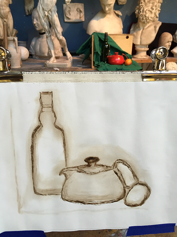 today I started my second tonal still life painting — oil painting #4. after working on the contour, my teacher wanted me to just paint flat shapes in the four tones, no details. if you squint it's easier to see the tones. when I did this, the bottle (which is dark green) looked almost black. I originally painted it with straight raw umber as I thought it would be the darkest tone, but it's a lighter brown. when I was fixing the tone of the background fabric, a mix of the white + raw umber gave me a really dark brown-black shade which was perfect, so I overpainted it with this. I had the teapot too dark originally also, so had to lighten it a smidge. I lost some of the contour shape when painting the flat colours, so will have to adjust this next week. but my teacher was happy with the tones so that's the main thing.
